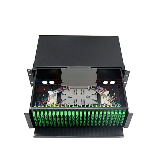 Organizador para fibra óptica con bandeja deslizable para mayor comodidad, chasis fabricado en lamina galvanizada recubierto de pintura anticorrosión electroestática, incluye puertos sc/apc y pigtails. Para rack de 19”.